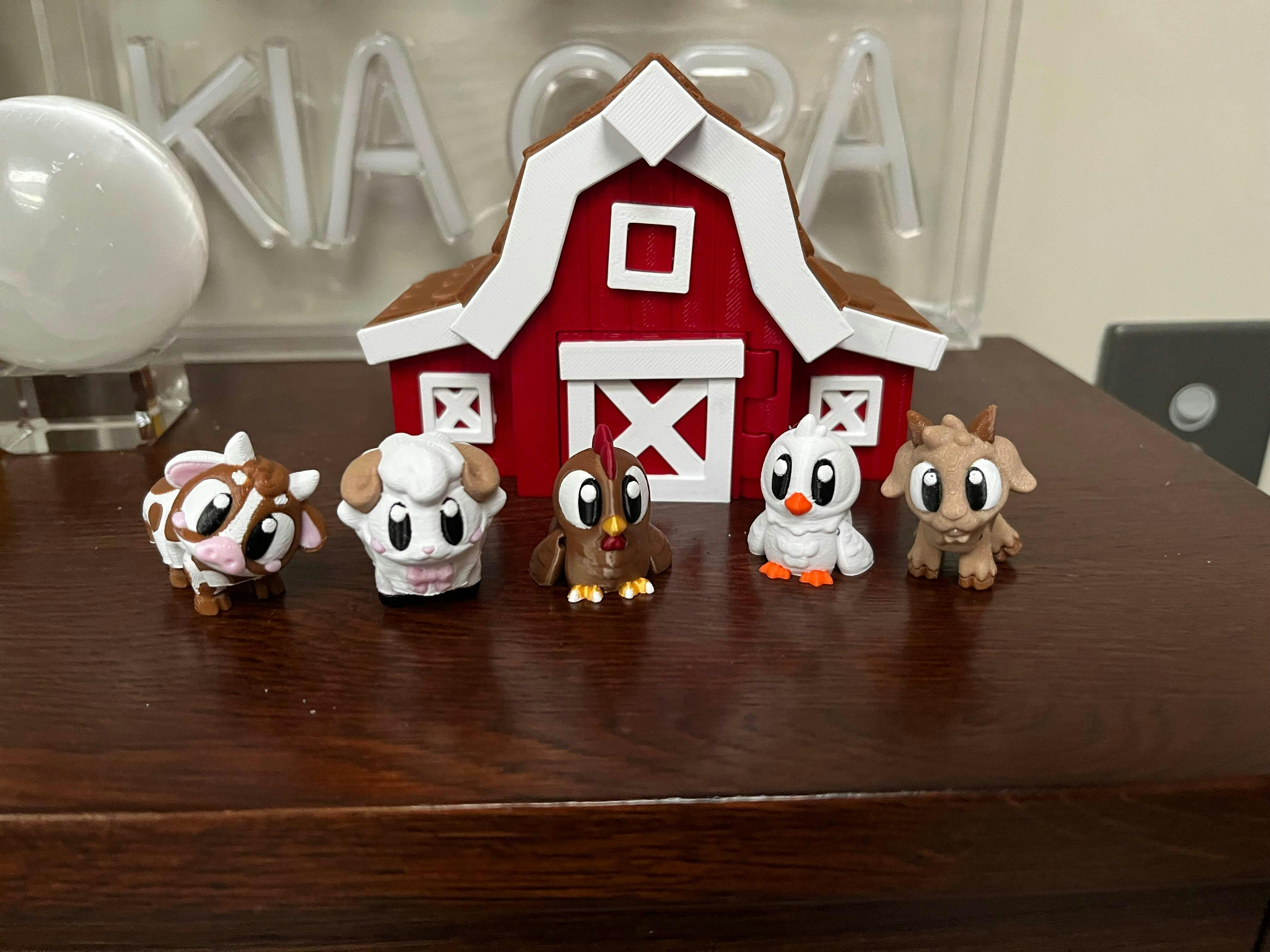 A classic red barn with a sweet little crew: lamb, goat, chicken, and duck.